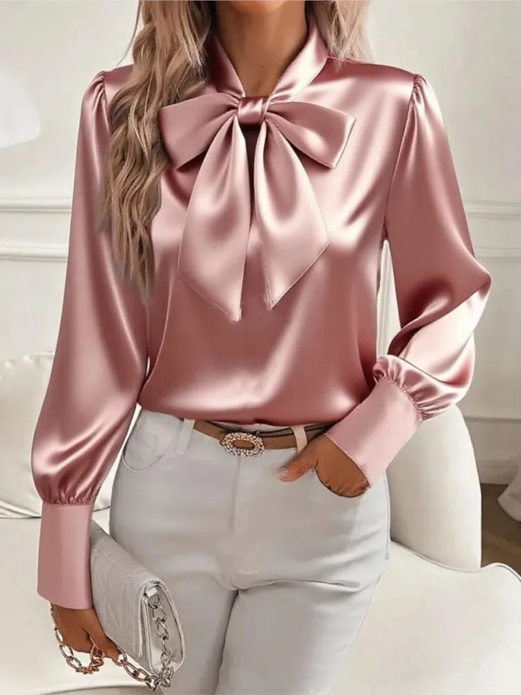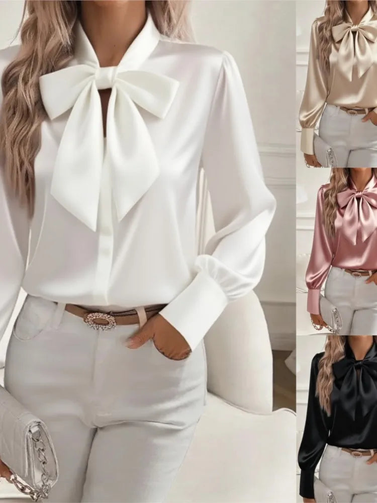 Korean Elegant Office Blouses Women Autumn Fashion Bow Neck Blusas Puff Sleeve Shirts Mujer Tops Spring Casual Solid Work Shirt