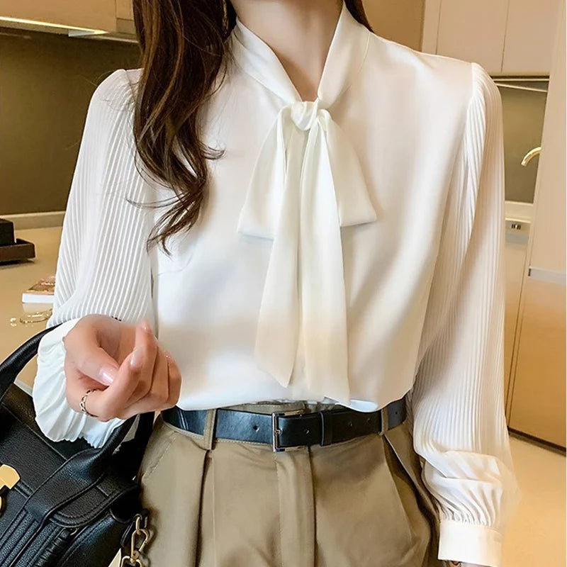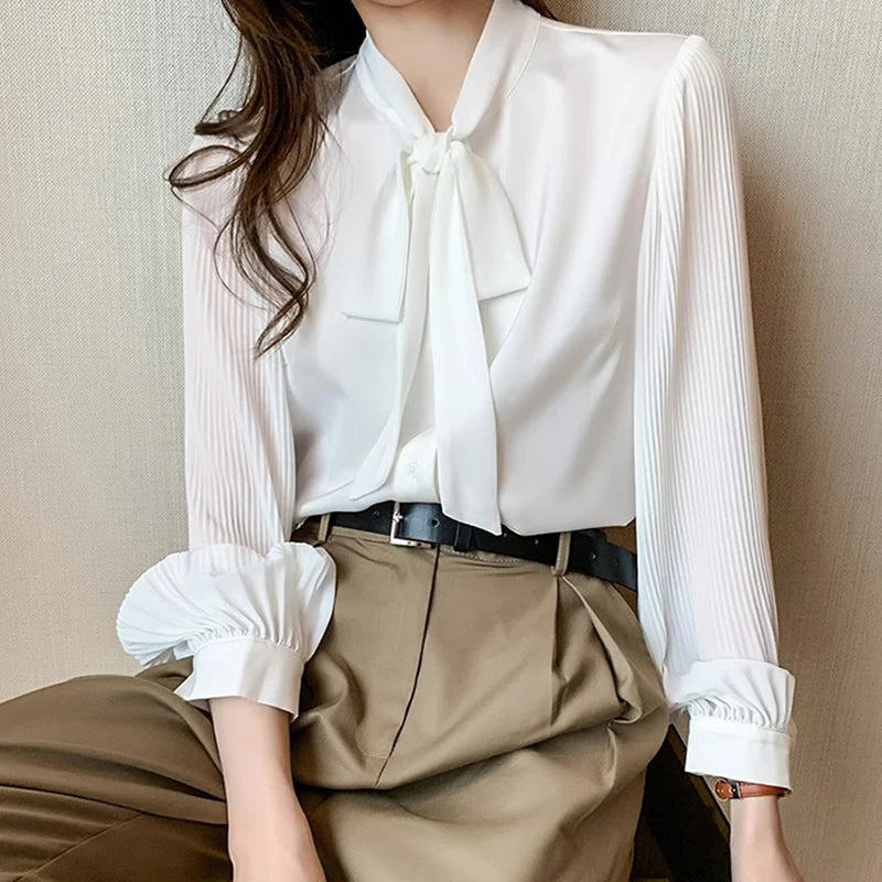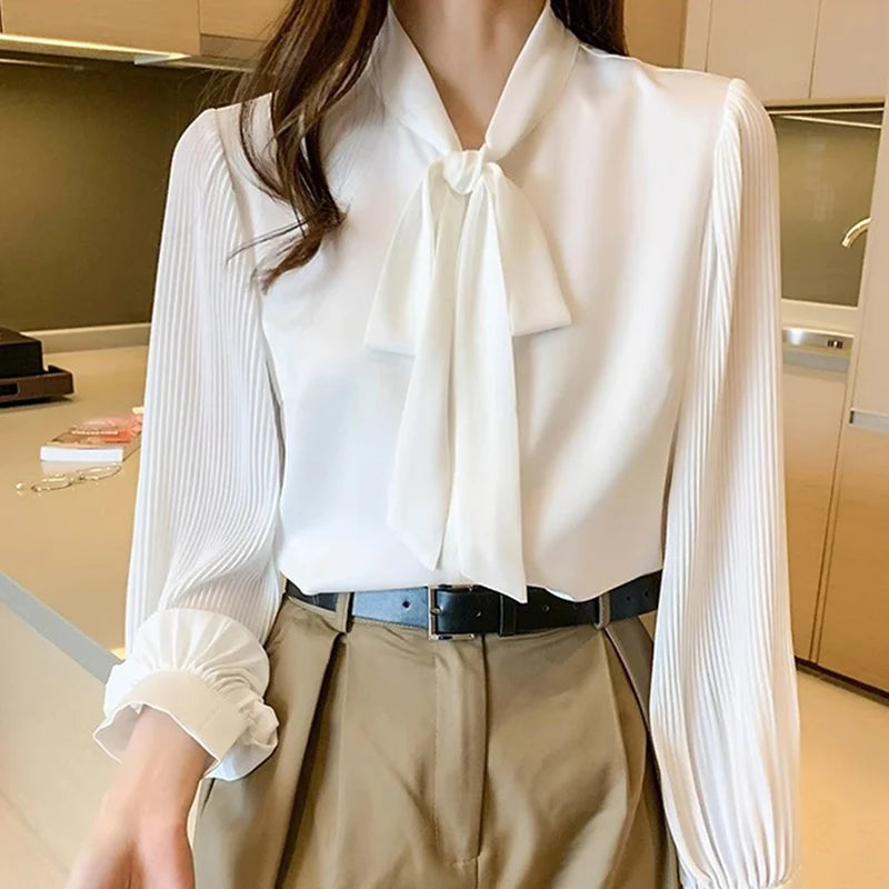 New Pleated Sleeve Chiffon Blouse Women Spring Summer Chic Design Bowknot Lace-Up Long Sleeve Shirt Simple Professional Clothing